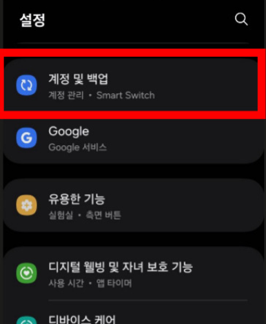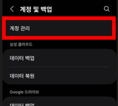 스마트폰의 설정에서 '계정 및 백업' 메뉴로 이동한 후 '계정 관리'를 선택합니다.