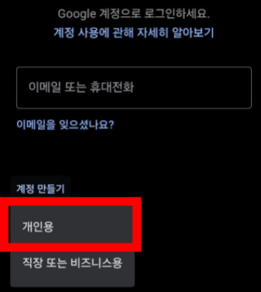 하단의 '계정 추가' 버튼을 누른 후 'Google'을 선택합니다. 이어서 '계정 만들기'와 '개인용' 옵션을 차례로 선택하게 됩니다. 이 과정에서 전화번호 인증 요청이 나타날 수 있는데, 이때 '건너뛰기' 옵션을 선택하면 됩니다.
