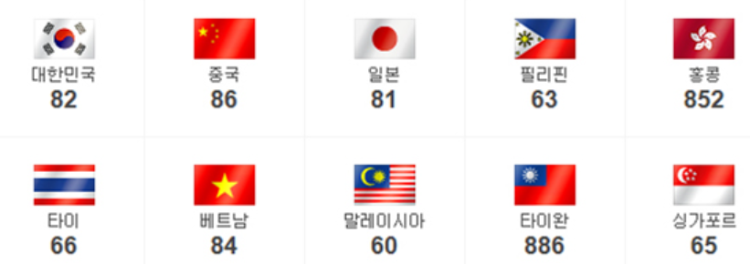- 국가번호: 국제전기통신연합(ITU)에서 지정한 각 국가별 고유 식별 번호입니다. 1~3자리의 숫자로 구성되어 있습니다.