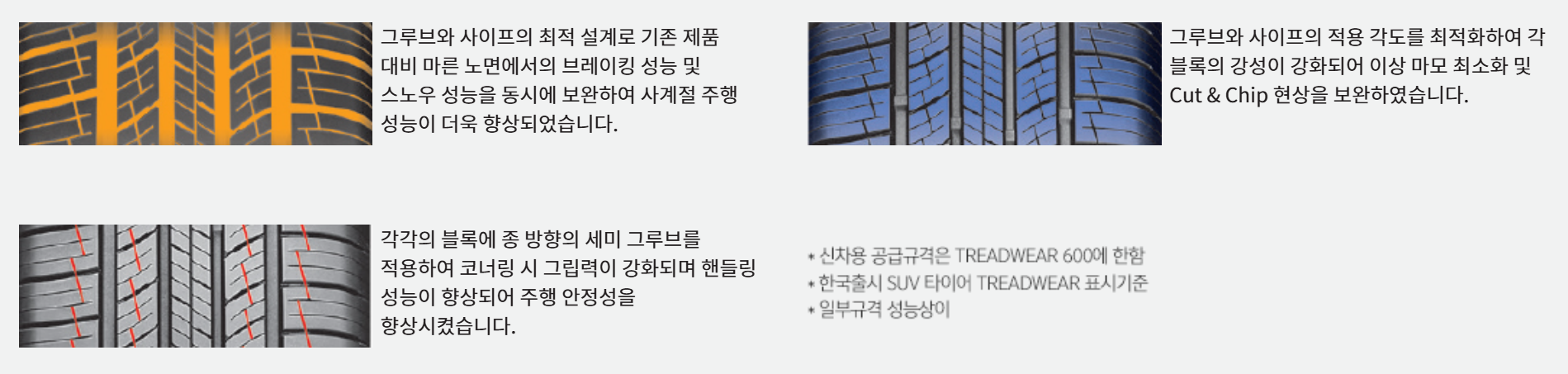 이 타이어는 출시 이후 국내외 다양한 SUV 운전자들로부터 높은 평가를 받고 있으며, 특히 합리적인 가격대비 우수한 성능으로 프리미엄 SUV 타이어 시장에서 강력한 경쟁력을 보여주고 있습니다.