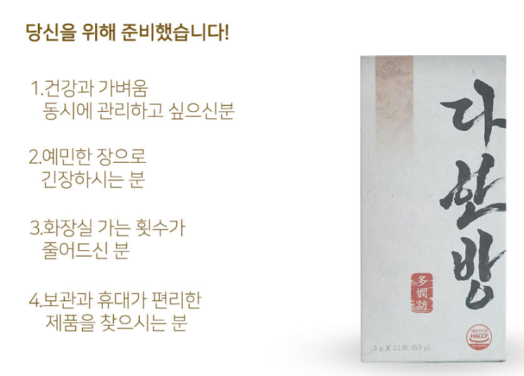 다한방은 전통 한방 레시피를 현대적으로 재해석한 다이어트 보조제로, 마황 성분을 제외하여 안전성을 높인 것이 특징입니다. 녹용, 차전자피 등의 핵심 성분을 통해 체질 개선과 체중 감량에 도움을 주며,