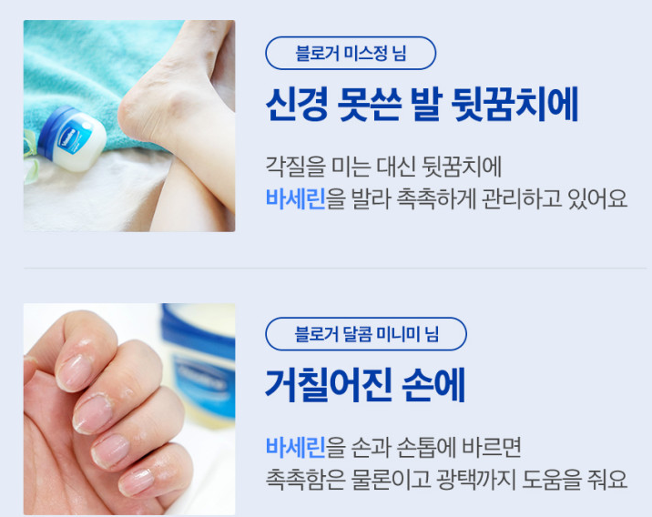 정기적인 바세린 사용은 피부 보습을 유지하고 습진 증상을 완화하는데 도움을 줍니다. 또한 다른 고가의 습진 치료제에 비해 경제적이면서도 효과적인 대안이 될 수 있습니다.