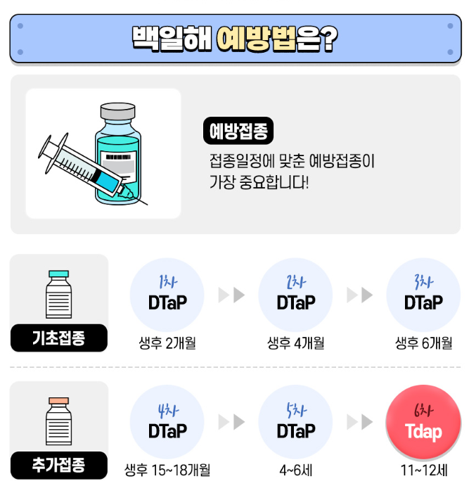 백일해 예방을 위해서는 연령대별로 적절한 예방접종 일정을 준수하는 것이 매우 중요합니다.