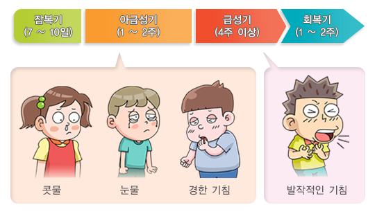 백일해는 크게 세 단계로 진행되며, 각 단계별로 뚜렷한 특징을 보입니다.