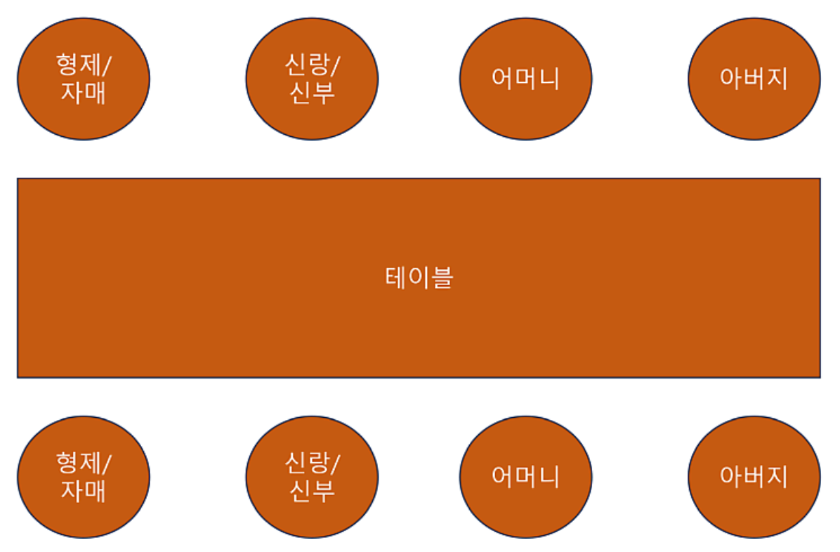 기본 배치를 유지하되 형제자매들은 출입문 쪽으로 배치합니다. 이는 화장실 이용이나 기타 상황에서 자유로운 이동이 가능하도록 하기 위함입니다. 만약 한쪽 가족의 형제자매 수가 많다면, 균형을 맞추기 위해 상대 가족은 친척을 초대할 수 있습니다.