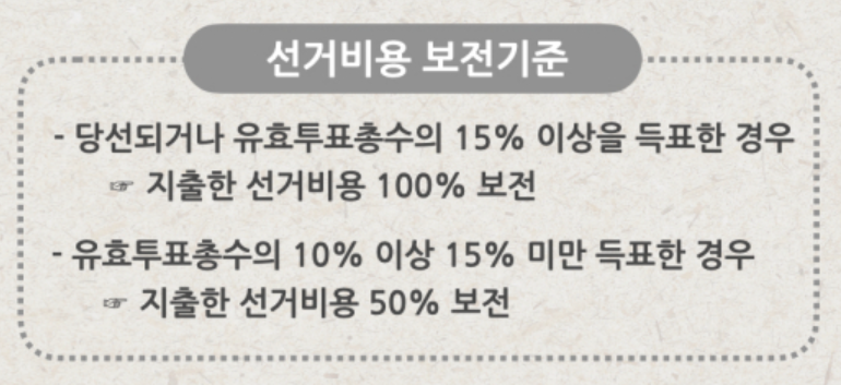 10~15% 미만의 득표율을 기록한 후보는 사용한 비용의 절반을 돌려받게 되며, 10% 미만의 득표율을 얻은 후보는 보전 대상에서 제외됩니다. 이러한 차등적인 보전 제도는 선거의 경쟁력과 효율성을 높이는 역할을 합니다.