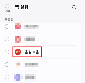 4. 녹음 앱 선택: 나타나는 앱 목록에서 상단 검색창에 "녹음"을 입력하고, 음성 녹음 앱을 선택합니다.