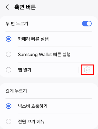 3. 앱 열기 선택: 검색 결과에서 "두 번 누르기"를 선택하고, 세 번째 앱 열기 항목에서 우측 톱니바퀴(설정 아이콘)를 선택합니다.