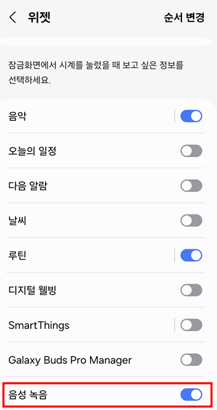 2. 위젯 활성화: 잠금 화면 및 AOD 설정에서 "위젯"을 선택한 후, 음성 녹음 항목을 활성화합니다.