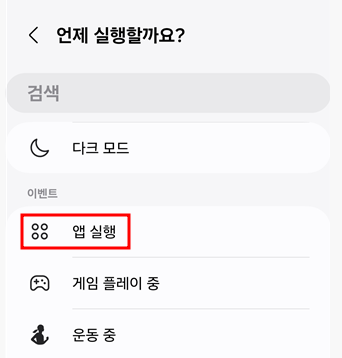 3. 앱 실행 선택: "앱 실행"을 선택하고, 상단 검색창에 "녹음"을 입력하여 선택한 후 완료 버튼을 누릅니다.