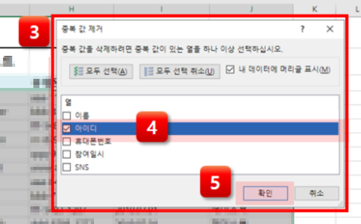 이런 경우에는 중복 제거 창에서 중복 여부를 확인할 열만 선택해야 합니다. 중복 제거 전에 반드시 원본 데이터를 백업해두는 것이 안전합니다. 실수로 잘못된 데이터가 삭제되는 것을 방지할 수 있기 때문입니다.