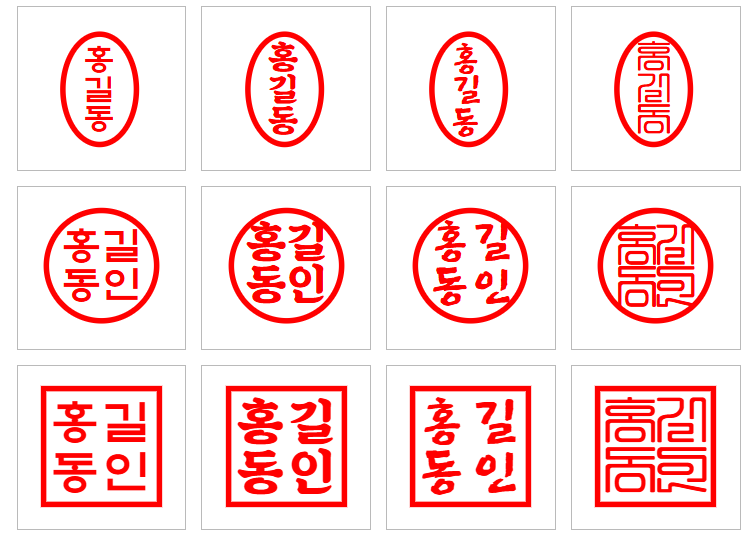 둥근 타원형과 사각형 형태의 다양한 도장 스타일을 제공하며, 선택할 수 있는 글씨체도 다양합니다.