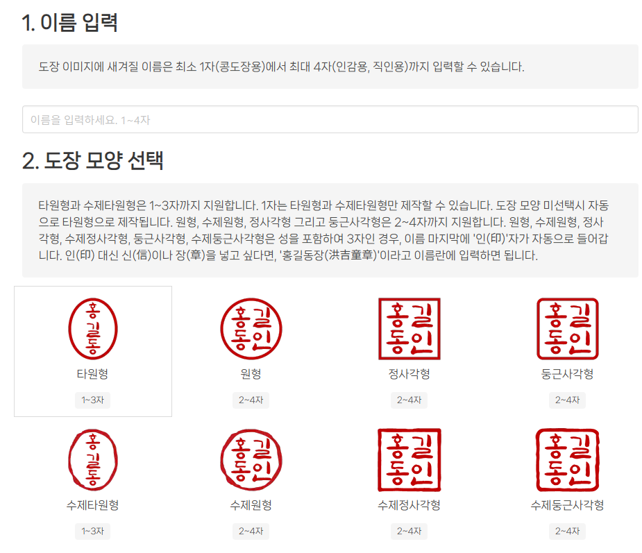 둥근 타원형과 사각형 형태의 다양한 도장 스타일을 제공하며, 선택할 수 있는 글씨체도 다양합니다.