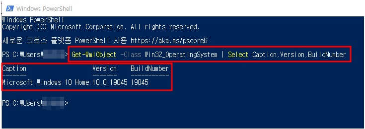 * 입력명령어 : Get-WmiObject -Class Win32_OperatingSystem | Select Caption,Version,BuildNumber