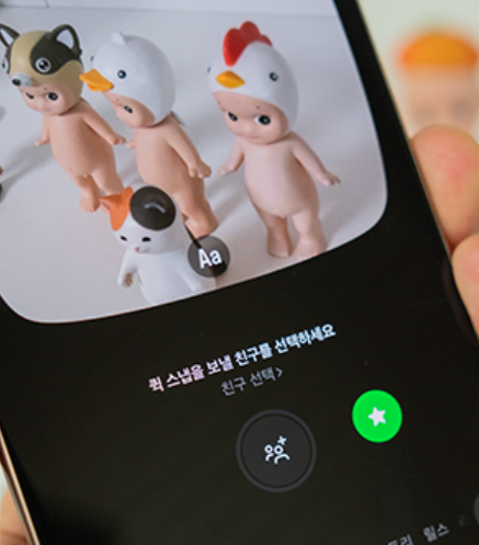 이후 공유하고 싶은 친구들을 개별적으로 선택하거나, 미리 설정해 둔 그룹 채팅방의 멤버들을 선택할 수 있습니다. 촬영 후에는 필요에 따라 Aa 아이콘을 통해 간단한 캡션을 추가할 수 있으며, 즉시 선택된 친구들에게 전송됩니다.