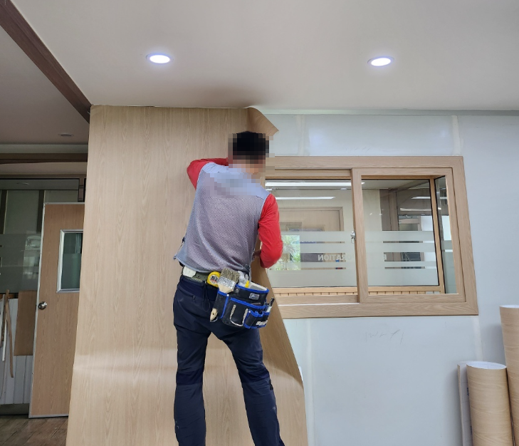 전문 시공용 본드를 균일하게 도포하고, 정확히 재단된 필름을 부착합니다. 이때 기포가 생기지 않도록 특수 도구를 사용하여 꼼꼼히 작업합니다. 모서리나 구석진 부분은 특히 세심한 주의를 기울여 마감합니다.