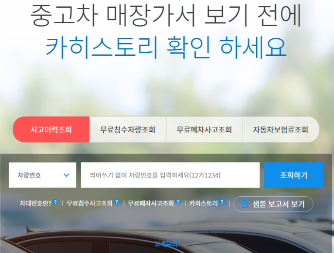 카히스토리는 차량번호를 입력하면 차량의 사고이력을 조회할 수 있는 서비스입니다. 차량의 사고이력 외에도 차량의 보험처리 이력, 차량의 진단이력, 차량의 수리이력 등도 확인할 수 있습니다.