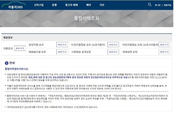 이런 정보를 통해 거래를 하려는 차량이 어떤 상태에 있는지 그리고 차량에 대한 기본적인 정보를 얻을 수 있습니다.