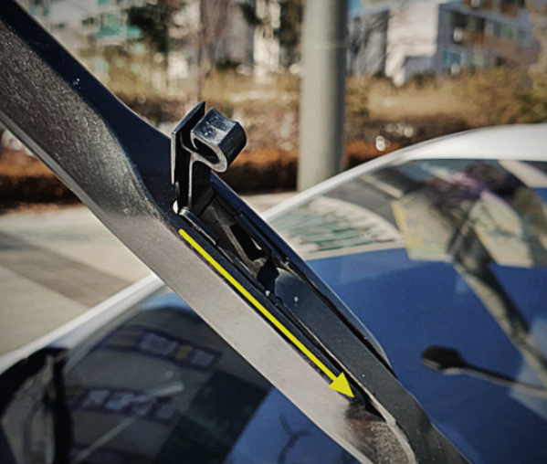 - 고정대의 커넥터를 찾아 탈거합니다. 대부분의 와이퍼는 클립이나 버튼 형태의 잠금장치가 있습니다. 이를 해제하고 와이퍼 블레이드를 밀어 분리합니다.