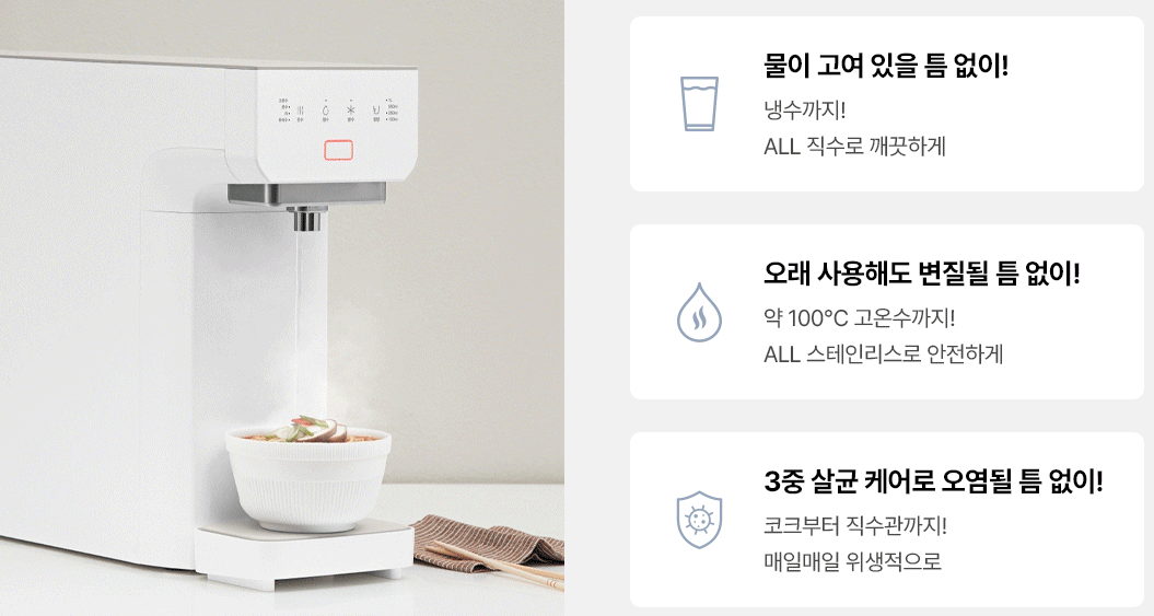 온수 기능은 커피나 차를 즐길 때 유용하고 냉수 기능은 여름철에 특히 편리하죠. 탄산수 기능은 탄산수를 자주 마시는 분들에게 매우 유용할 수 있습니다.