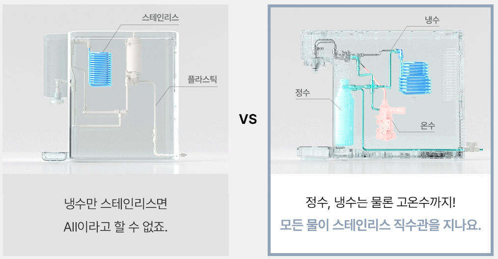반면, 직수형은 위생 관리가 중요한 가정용으로 많이 쓰이죠. 직수형은 렌탈료가 7,000원에서 8,000원 정도, 제품 가격은 40만 원에서 50만 원 정도 더 비쌉니다.