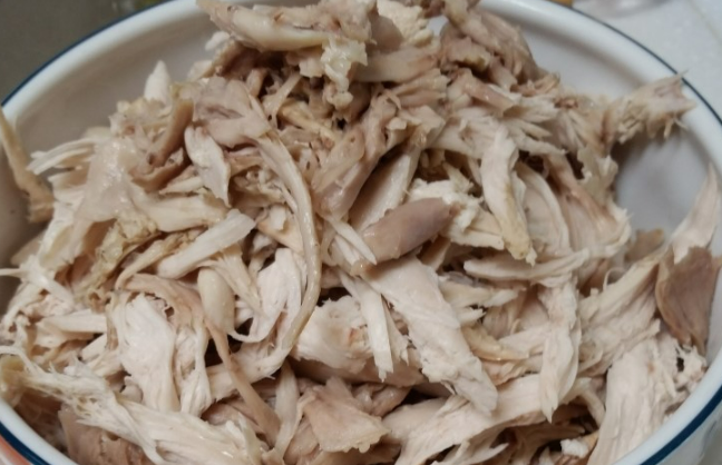 2. 익힌 닭가슴살을 찬물에 식혀서 먹기 좋게 찢어줍니다.