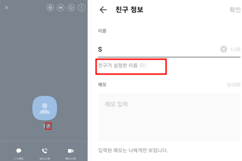 그럼 친구의 프로필 화면이 나타나는데 이름 옆에 작은 연필 모양의 버튼이 보이실 겁니다. 이 버튼을 누르게 되면, 내가 지정한 그 친구의 이름을 볼 수 있게 됩니다.