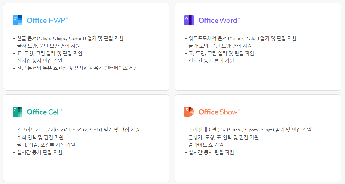 한컴오피스 웹 버전은 단순히 한글뿐만 아니라 한워드, 한셀, 한쇼, 한폼 등 총 5가지의 프로그램을 제공하여 다양한 문서 작업을 가능하게 합니다.
