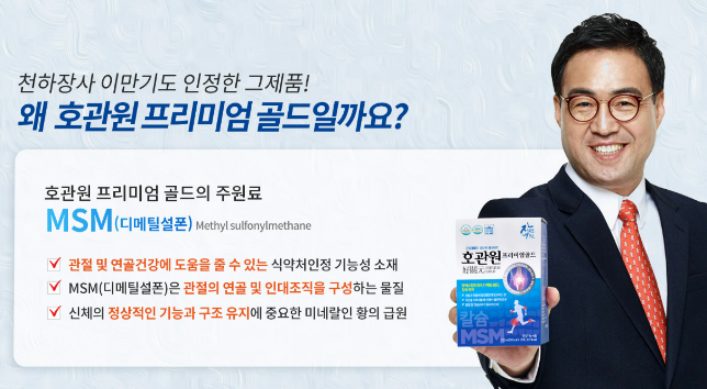 호관원 프리미엄의 가장 큰 특징은 MSM(디메틸설폰)과 칼슘(젖산칼슘+해조칼슘)이 주 성분으로 사용되었다는 것입니다. MSM은 관절의 연골 및 인대조직을 구성하는 물질로 황이라는 중요한 미네랄의 공급원 역할을 합니다.