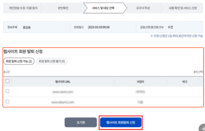 이렇게 조회가 완료되고 나면 페이지가 넘어가면서 회원 탈퇴신청이 가능한 사이트가 몇 개인지 나오게 됩니다. 그래서 아래쪽으로 내려보시면 내가 어떤 사이트에 가입이 되어 있었는지 확인이 가능한데요.