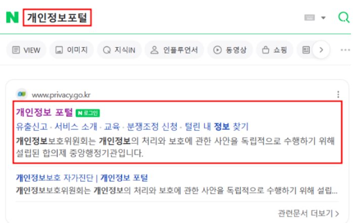 검색창에 개인정보포털이라고 검색을 하면 바로 사이트가 나오게 됩니다. 사이트 링크는 아래를 참고하시고 개인정보포털을 눌러서 들어가 보겠습니다.