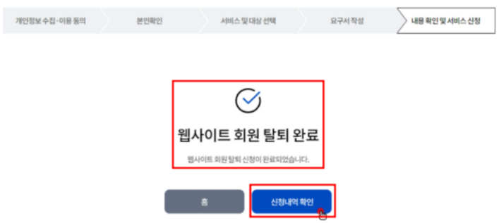 다음 단계로 확인 버튼 누르면 웹사이트 회원탈퇴 신청 완료라고 확인할 수 있고 신청내역 확인 눌러 보시면 내가 어떤 사이트 탈퇴 신청했는지 확인하실 수 있습니다.