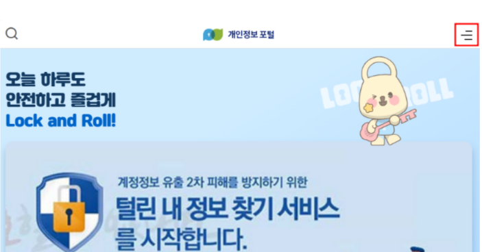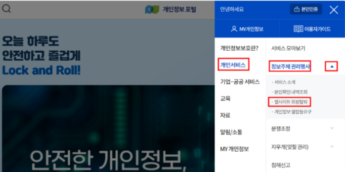개인정보포털에 들어오셨다면 오른쪽 상단 줄 세 개를 눌러 보도록 하겠습니다. 줄 세 개 누른 후에 왼쪽에 개인서비스 눌러 주시고 정보주체 권리행사라고 되어 있는 부분의 화살표를 터치해 보겠습니다.