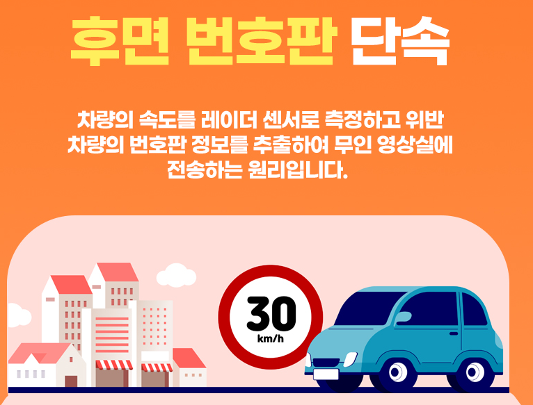 후면단속카메라는 레이더 방식을 사용하여 차량의 속도를 측정하고 번호판을 촬영합니다.