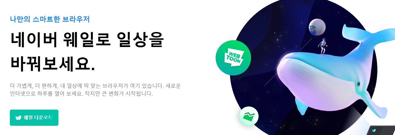 네이버 웨일 공식 웹사이트(whale.naver.com)에서 브라우저를 다운로드하여 설치할 수 있습니다.