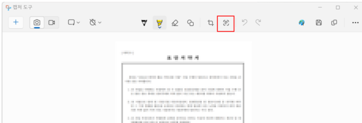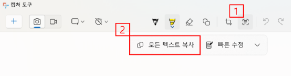 화면 우측 하단에 나타나는 캡처 알림을 클릭하여 편집기를 엽니다 편집기 상단의 '텍스트 작업' 버튼을 클릭합니다 텍스트가 인식되면 '모든 텍스트 복사' 버튼을 눌러 클립보드에 저장합니다