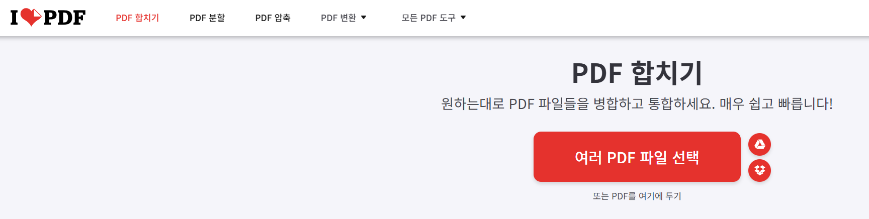 반면 빠른 전체 파일 병합이 필요한 경우에는 별도 설치 없이 즉시 사용 가능하고 처리 속도가 빠른 iLovePDF를 추천합니다.